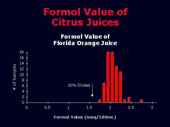 Amino Acids The formol value of fruit juices is an approximate measure of the concentration of free amino acids in the juice. Sugar addition to juices will result in declines in the formol value. Figure 11 shows the distribution of formol values in a set of pure Florida orange juices. The arrows indicate how a 20% substitution of sugar would affect the average sample in the distribution. A 20% substitution pulls the average sample completely outside of the normal range. Relative concentrations of proline and other individual amino acids can also provide diagnostic information about the purity of a juice. Anthocyanin Pigments ![]() Carbon SIRA ![]() Minerals ![]() Oligosaccharides ![]() Organic Acids ![]() Phenolics ![]() Sugars/Sorbitol ![]() ![]() Copyright © Krueger Food Laboratories, Inc. all rights reserved. |