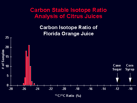 Carbon Stable Isotope Ratio Analysis The carbon stable isotope ratio method relies upon differences in the 13C content in the carbon of most common fruit juices on the one hand, and of cane sugar and corn syrup on the other. The figure below shows the distribution of 13C/12C ratios (delta values) of a group of pure Florida orange juices. The arrows in Figure 1 indicate the average values of cane sugar and corn syrup 13C/12C ratios. The narrow range of the distribution allows for sensitive detection of cane sugar and corn syrup and many common fruit juices. Amino Acids ![]() Anthocyanin Pigments ![]() Minerals ![]() Oligosaccharides ![]() Organic Acids ![]() Phenolics ![]() Sugars/Sorbitol ![]() ![]() Copyright © Krueger Food Laboratories, Inc. all rights reserved. |